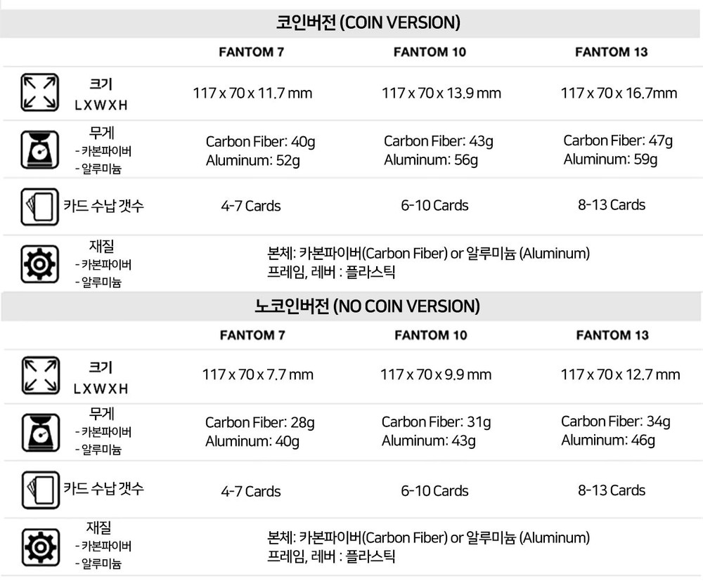 왼쪽부터 FANTOM 7, FANTOM 10, FANTOM 13 두께입니다. (노코인 버전)