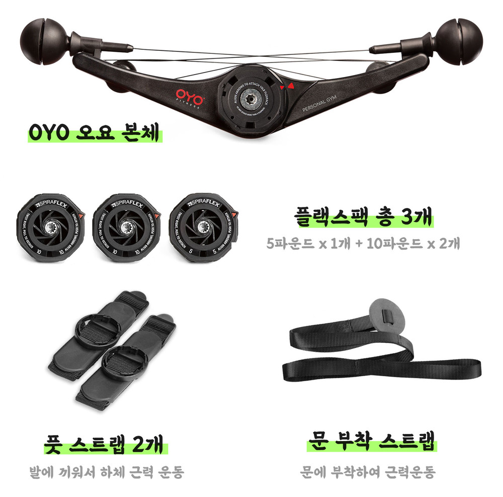 오요는 약 1kg정도의 가벼운 무게로 휴대성이 높으며, 스파이라플렉스(SpiraFlex)라는 저항 기술을 사용하여 최대 11.3kg까지의 저항력을 주는 근력 전문 운동기기입니다. 또한 공간을 많이 차지 하지 않아 어디든 들고 다니면서 운동이 가능하고, 70가지의 상하체 운동을 할 수 있는 점이 장점입니다.